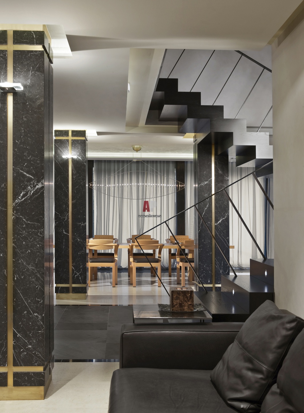 Лестница в интерьере первого этажа выглядит легко и воздушно благодаря ограждению из металла.