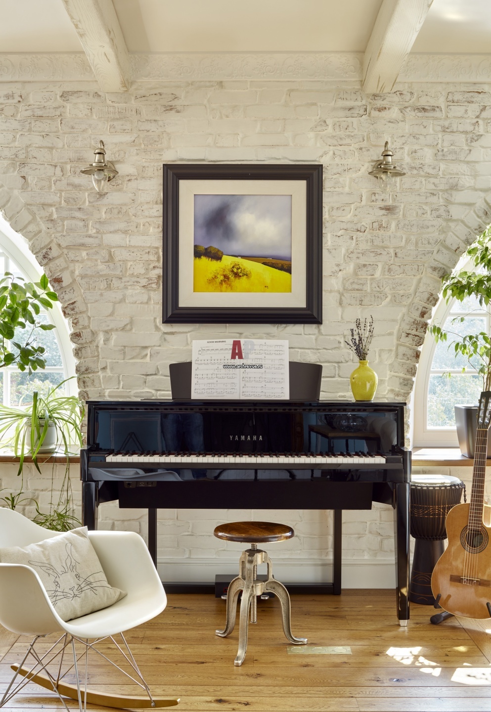 Украшение гостиной – два полукруглых окна. Кресло-качалка Vitra. Подушка с зайцем, Anthropologie. Электророяль, Yamaha. Стул, Andrew Martin. Живопись, Barry Hilton.