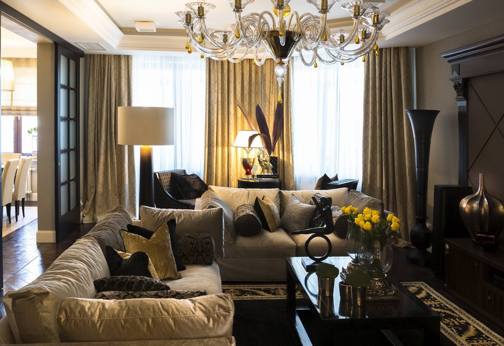Интерьер гостиной в стиле американской классики с элементами ар-деко. Диваны, Meridiani (модель Quinn). Журнальный стол, Andrew Martin (модель Pagoda). Люстра Soffio от Sylcom. Ковер, Boccara.