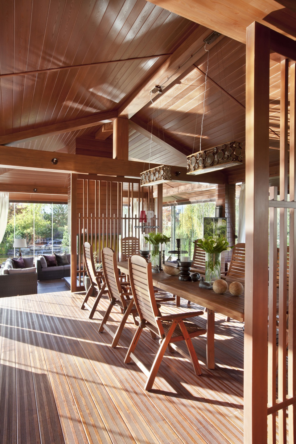 Обеденная зона на террасе. Безрамное остекление может летом при необходимости полностью складываться. Тогда интерьер становится частью ландшафта.