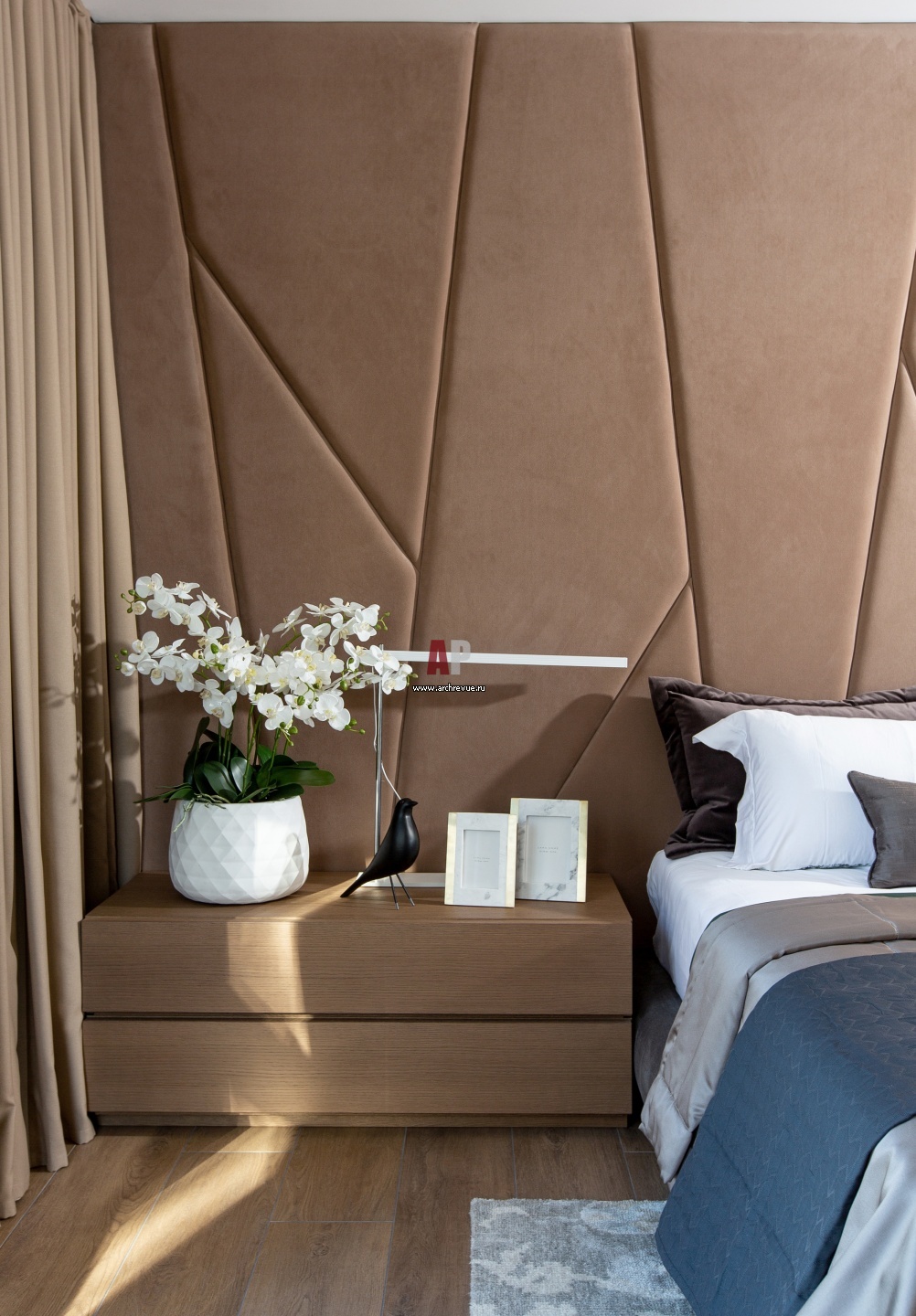 В каждой из трех спален дизайнеры выделили зону изголовья, которая сразу привлекает к себе внимание своей необычной фактурой и подчеркивает характер каждого из ее владельцев. В спальне хозяев использованы текстильные панели цвета корицы с активной геометрией.
