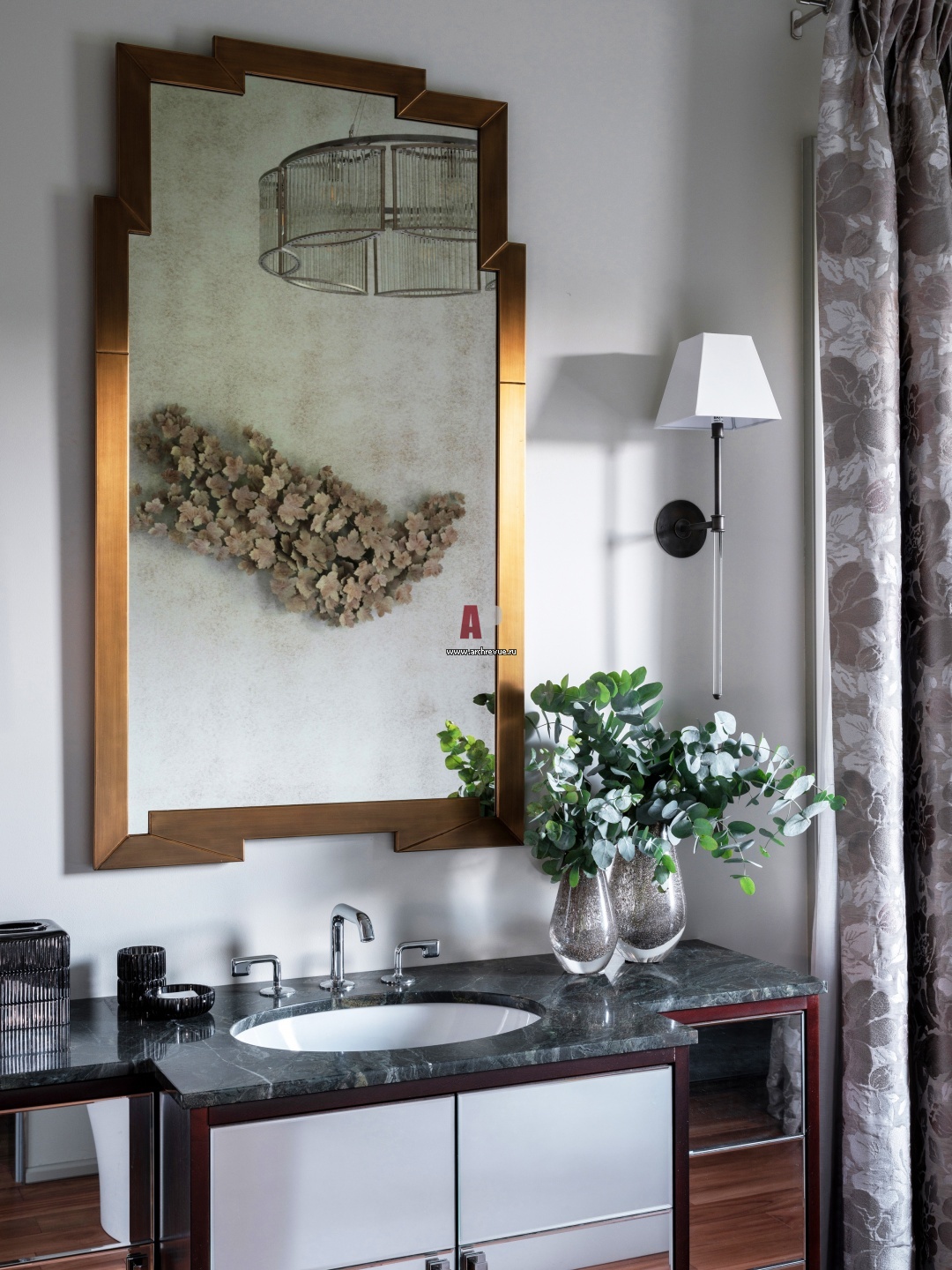 Хозяйский санузел с элементами ар-деко и неоклассики. Декоративные панно, Art et Floritude. Зеркало, Julian Chichester.