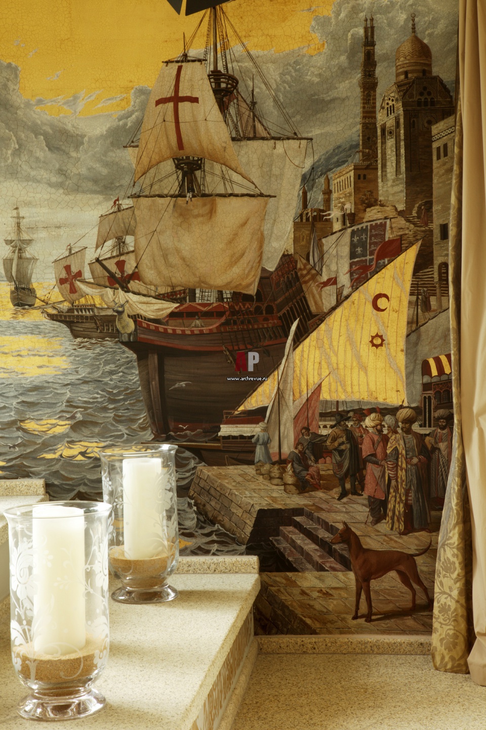Справа от лестницы – живописная фантазия в духе Беллини с изображением торговых судов. Исторические аллюзии на итальянский Ренессанс придали интерьеру вид вне времени.