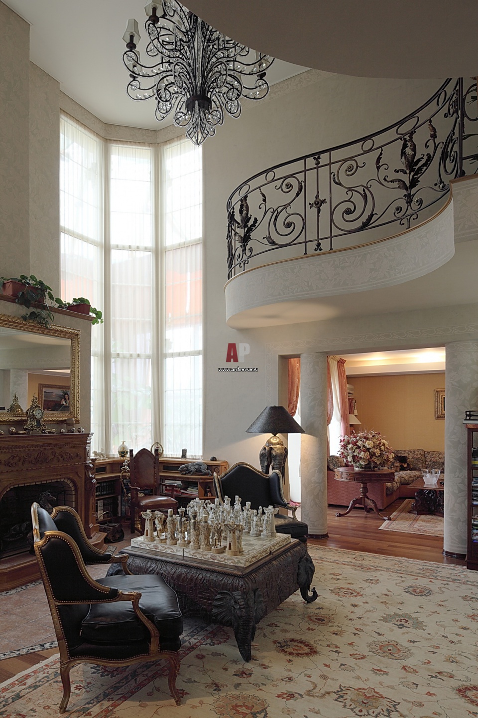 Центральное место занимает двухуровневая гостиная с камином и балконом второго этажа. От нее в две стороны расходятся одноуровневые помещения приватной зоны отдыха и столовой с кухней.
