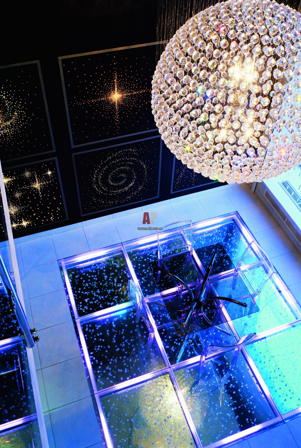 Центральная люстра-шар большого диаметра выполнена на фабрике Swarovski под заказ. Она собрана из нескольких сотен кристаллов, которые рассеивают вокруг себя свет и создают мистическую ауру.