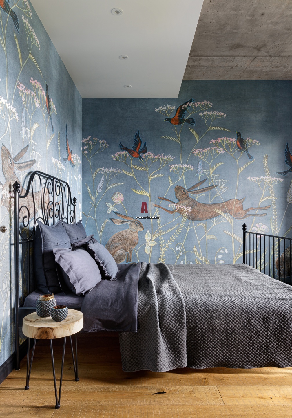 В гостевой спальне первого этажа присутствуют сказочные мотивы. Обои Factura Wallpaper. Кровать, «Икеа». Столик, декор, Zara Home. Потолок частично бетонный.