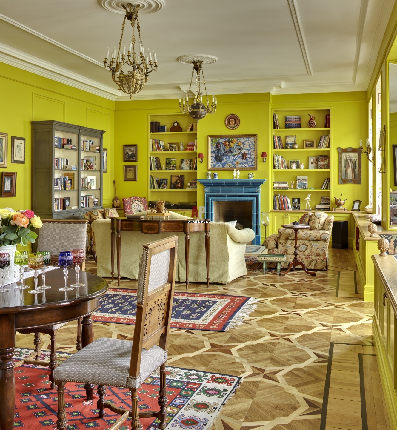 Интерьер классической гостиной насыщенно желтого цвета с бирюзовым камином. Портал камина из бирюзовой керамики сделал питерский мастер Юрий Осинин в духе изделий XVIII-XIX вв. Кресло у камина, консоль за диваном, поставщик Charles.Cameron.