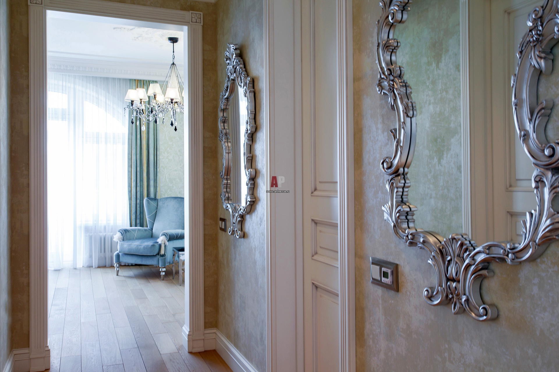 Светлый коридор декорирован зеркалами в ажурных серебряных рамах.
