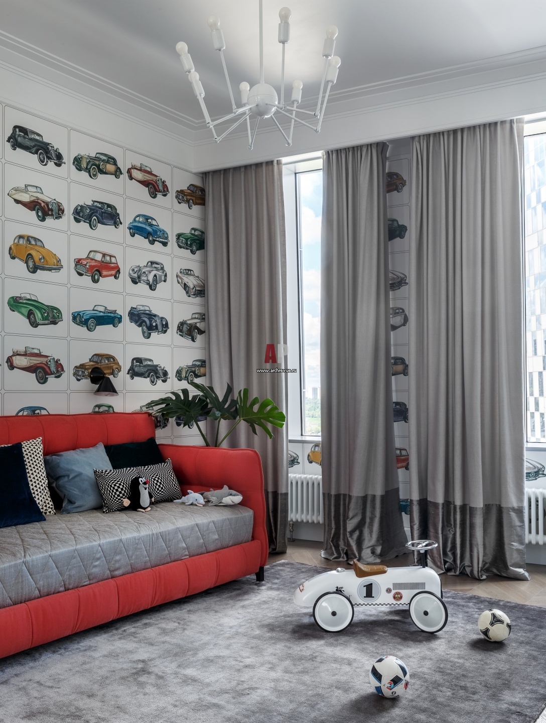 Детская комната мальчика. На стенах – обои с рисунком автомобилей. Диван, на заказ. Люстра, De La Espada. Бра, Areti. Ковер, Serge Lesage.