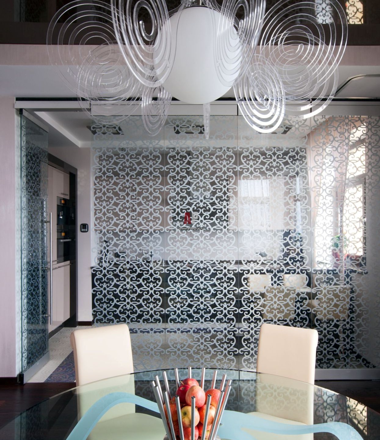 Перегородки Dorma из триплекса с вмонтированным внутрь прозрачным полотном с рисунком набраны из 7 полотен. Каждое из них движется самостоятельно, поэтому перегородка имеет несколько вариантов открывания.