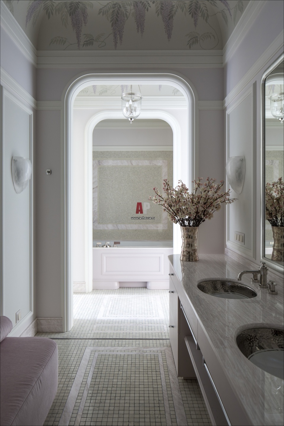 Хозяйская ванная комната представляет собой анфиладу, которая соединяет душевую, умывальник и ванну, расположенную в нише.