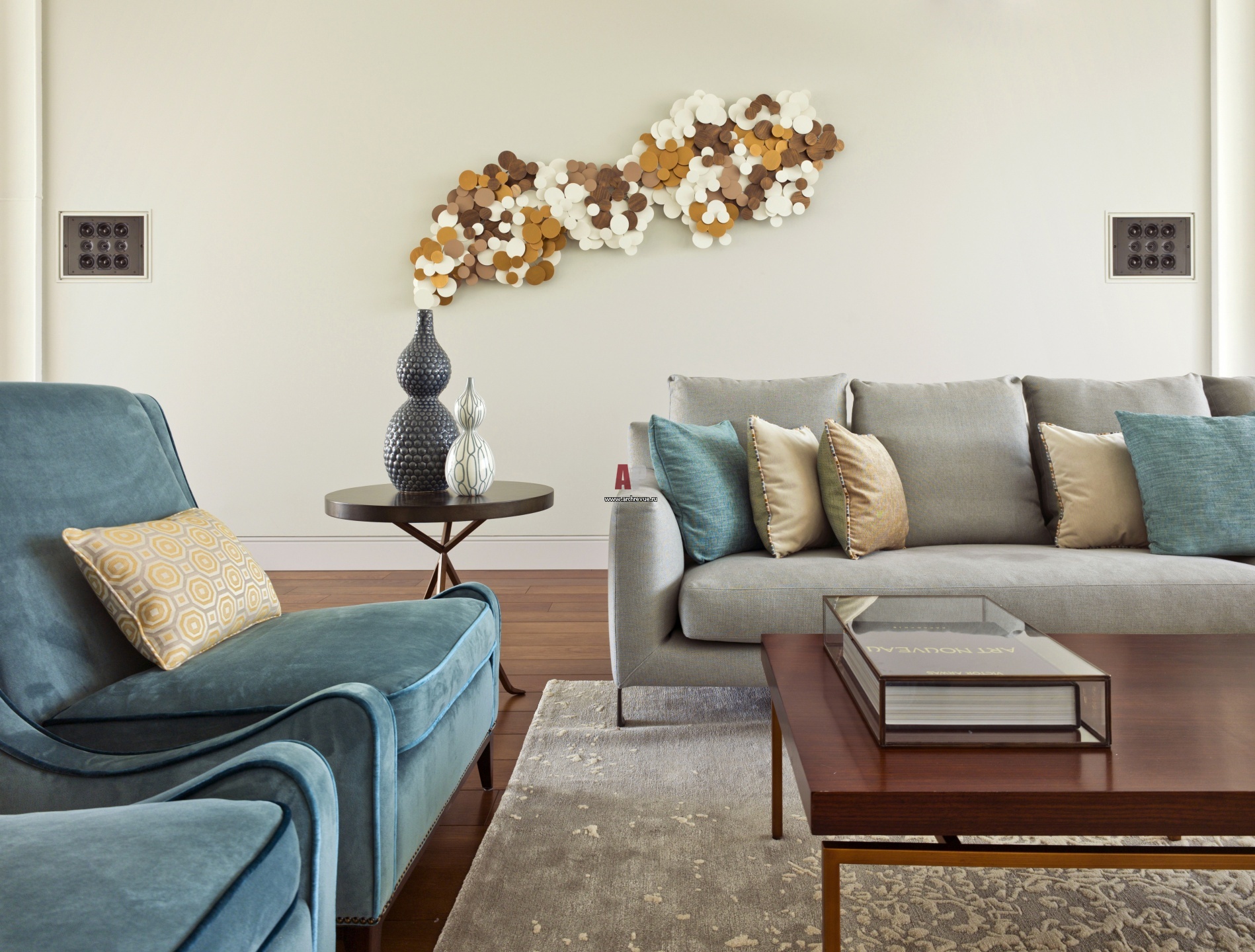 Интерьер гостиной – эклектичный микс из устрично- белых стен, медных и латунных деталей в отделке мебели и бирюзового текстиля.