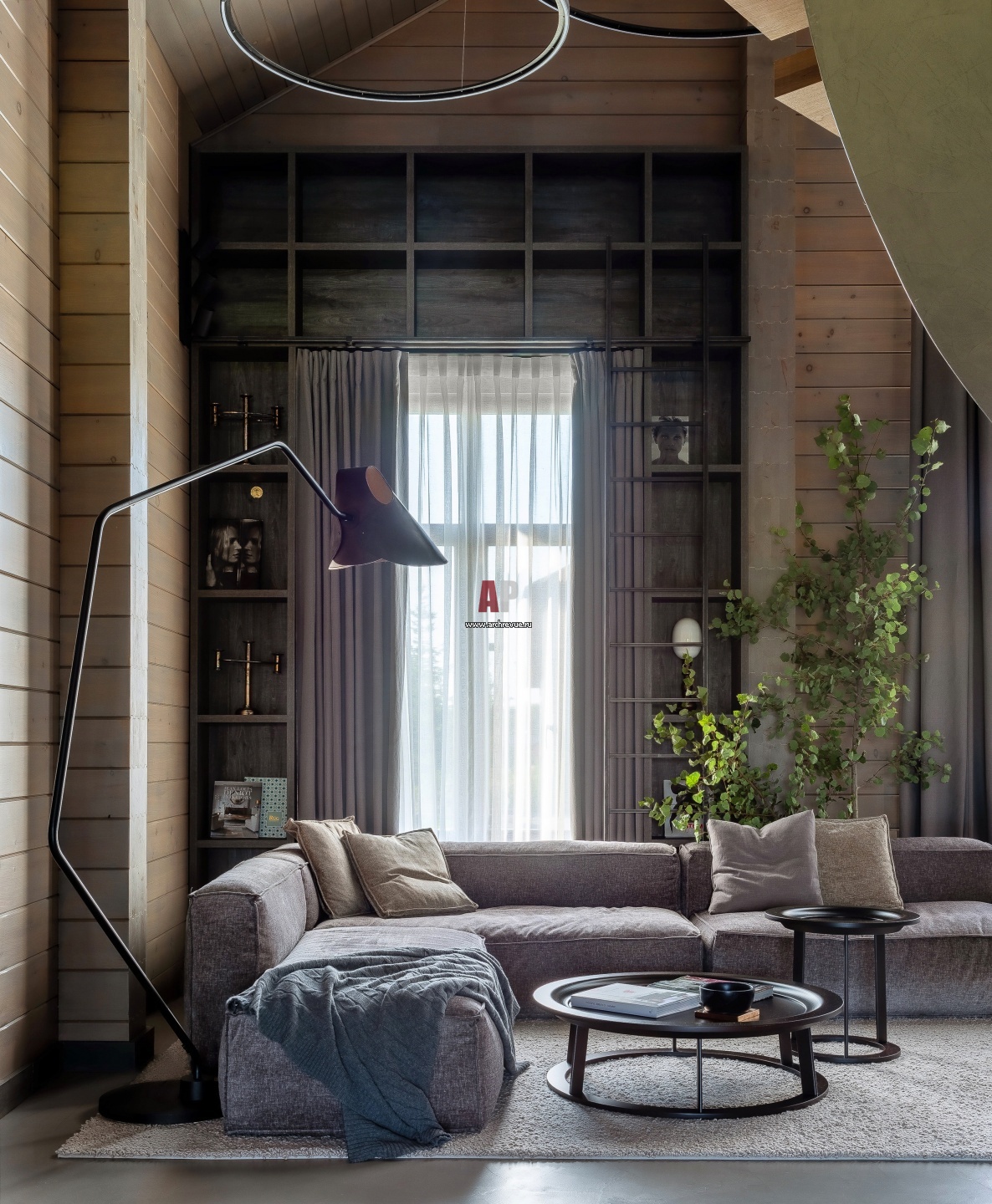 Деревянная усадьба на Алтае с северным характером. Диванная группа в гостиной.