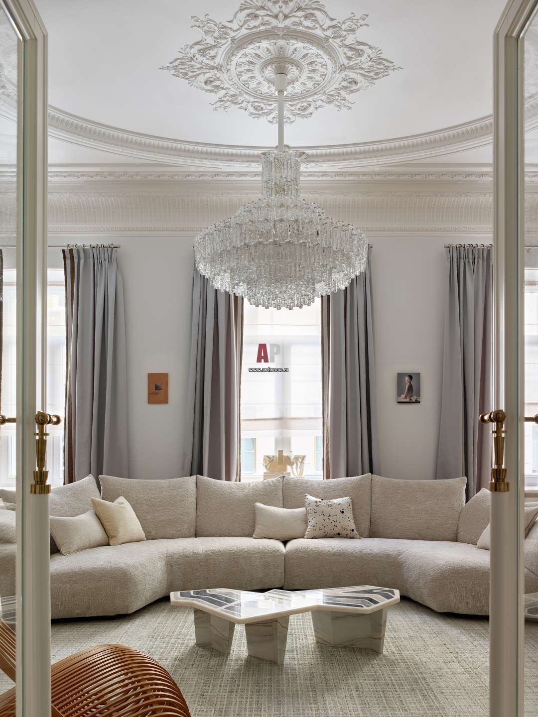 Вид из коридора на парадную гостиную. Лепнина разработана совместно с мастерами из Санкт-Петербурга. За основу взят французско-бельгийский декор XIX века. Получилась эклектика с элементами барокко и классики.