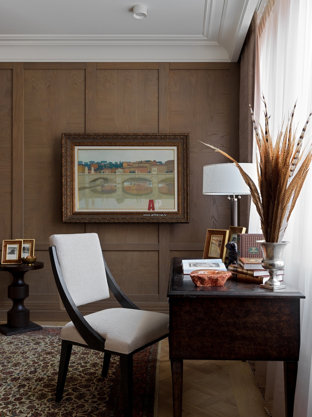 Стены кабинета зашиты традиционными дубовыми панелями. В помещении установлен раскладной диван, поэтому оно может трансформироваться в гостевую спальню. Стены обшиты традиционными деревянными буазери. Рабочий стол, Gnoato Fratelli. Настольная лампа, Robert Abbey. Стул, Bernhardt. Картина «Мост Витторио Эммануэл» работы Олега Иващенко.