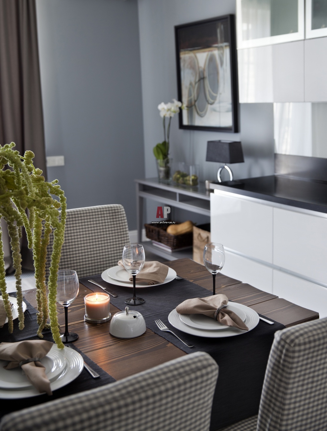 Кухня с белыми глянцевыми фасадами, Cucine Lube. Столешница из черного агломерата, фартук из закаленного белого стекла. Аксессуары, посуда, Crate and Barrel и BoConcept.