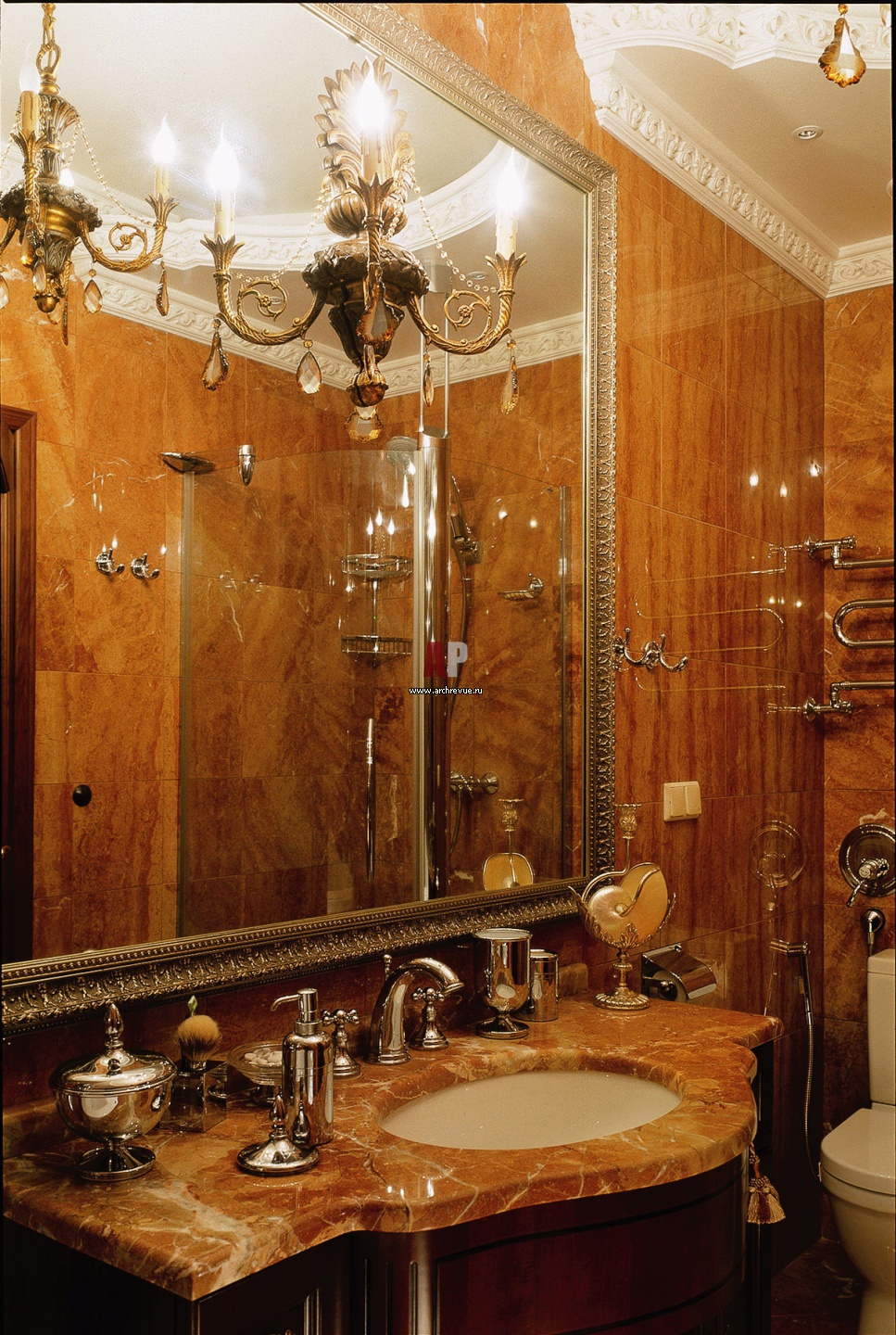 Санузел оформлен натуральным мрамором красивого сливочно-кирпичного цвета. Золоченые багеты и лепнина добавляют шарма.