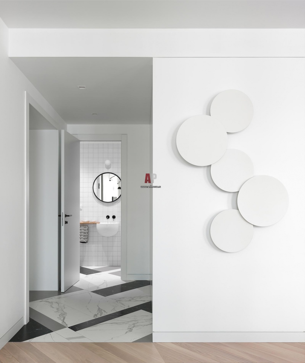 Интерьер белой квартиры с кирпичными стенами. Вид из гостиной на гостевой санузел.