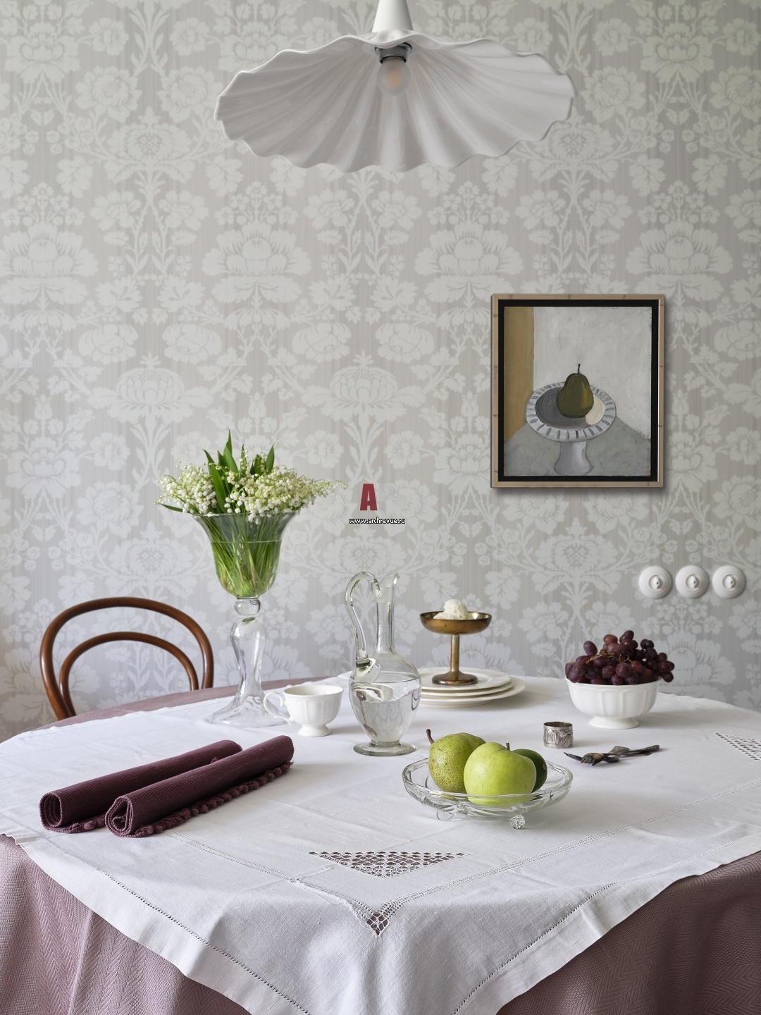 Столовая группа в общей гостиной. Обои с рисунком «дамаск», Farrow&Ball. Светильник, Original BTC, модель Christie Pendant.