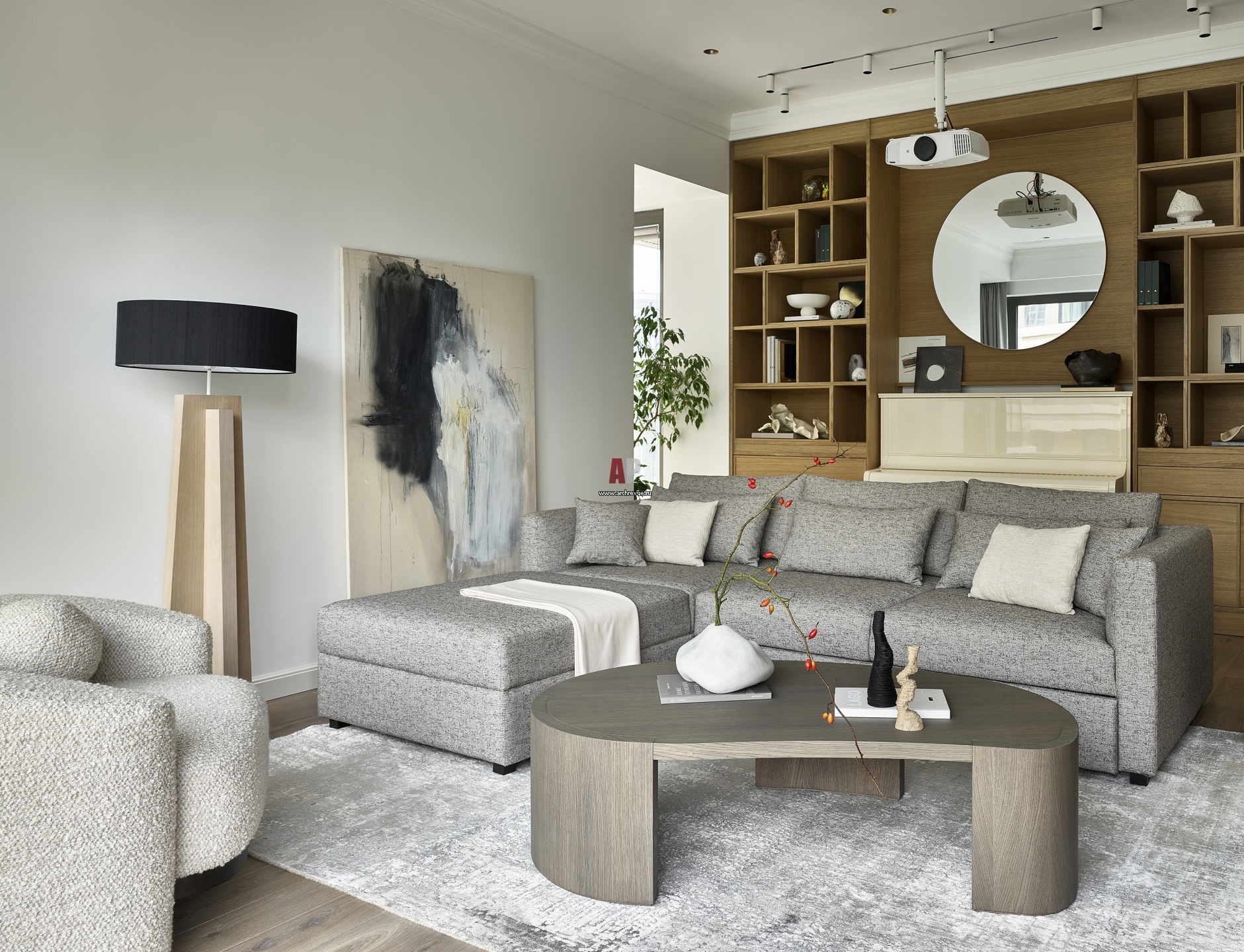 Гостиная. Торшер Modenature, модель Memmi. Библиотека, на заказ по эскизам дизайнера, массив и МДФ под шпоном дуба европейского, масло Osmo.