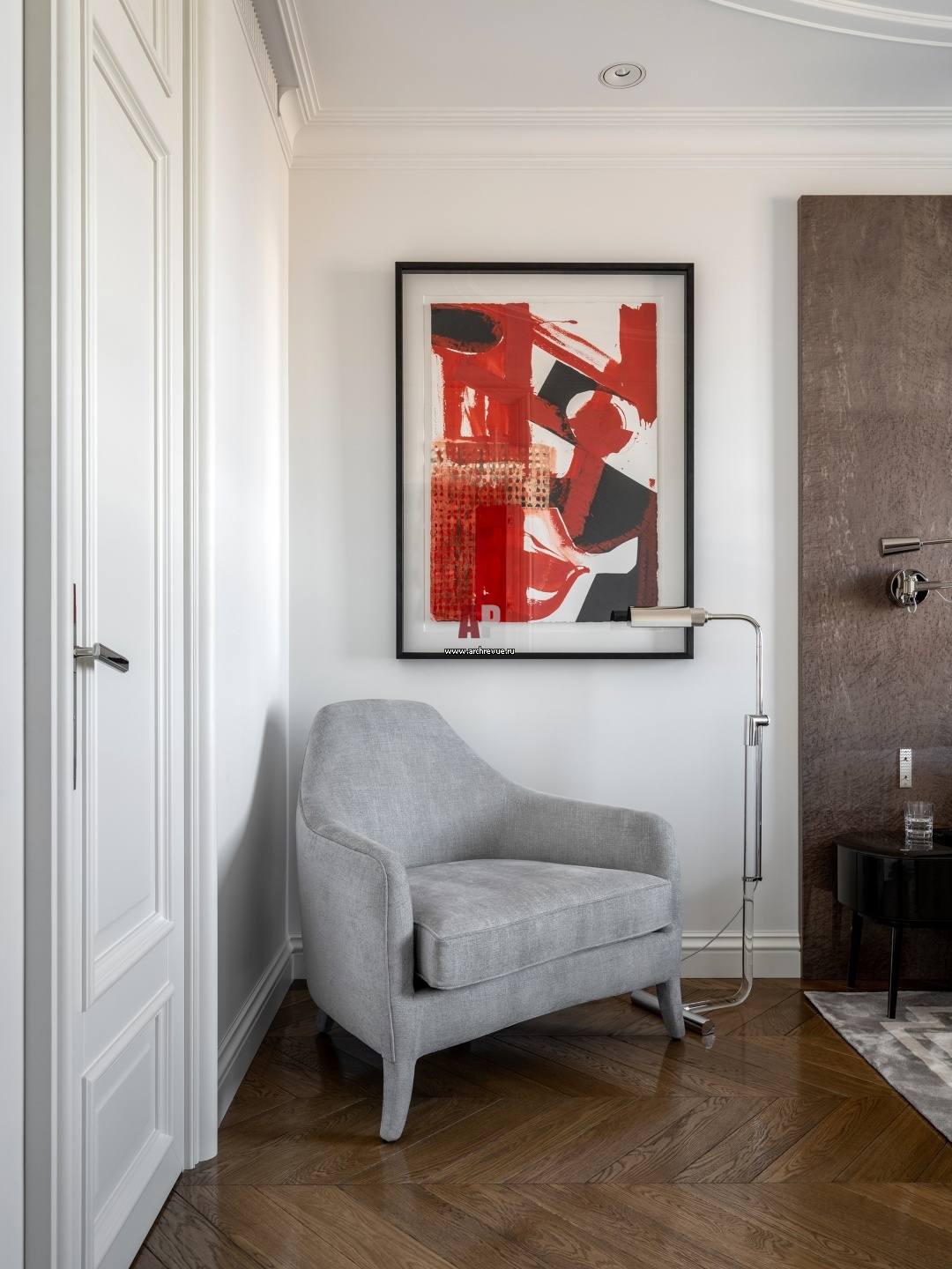 Квартира для медийной личности и организаторов ивентов. Фрагмент спальни. Картина, Bruno Moinard. Кресло, Munna. Торшер, Ralph Lauren.