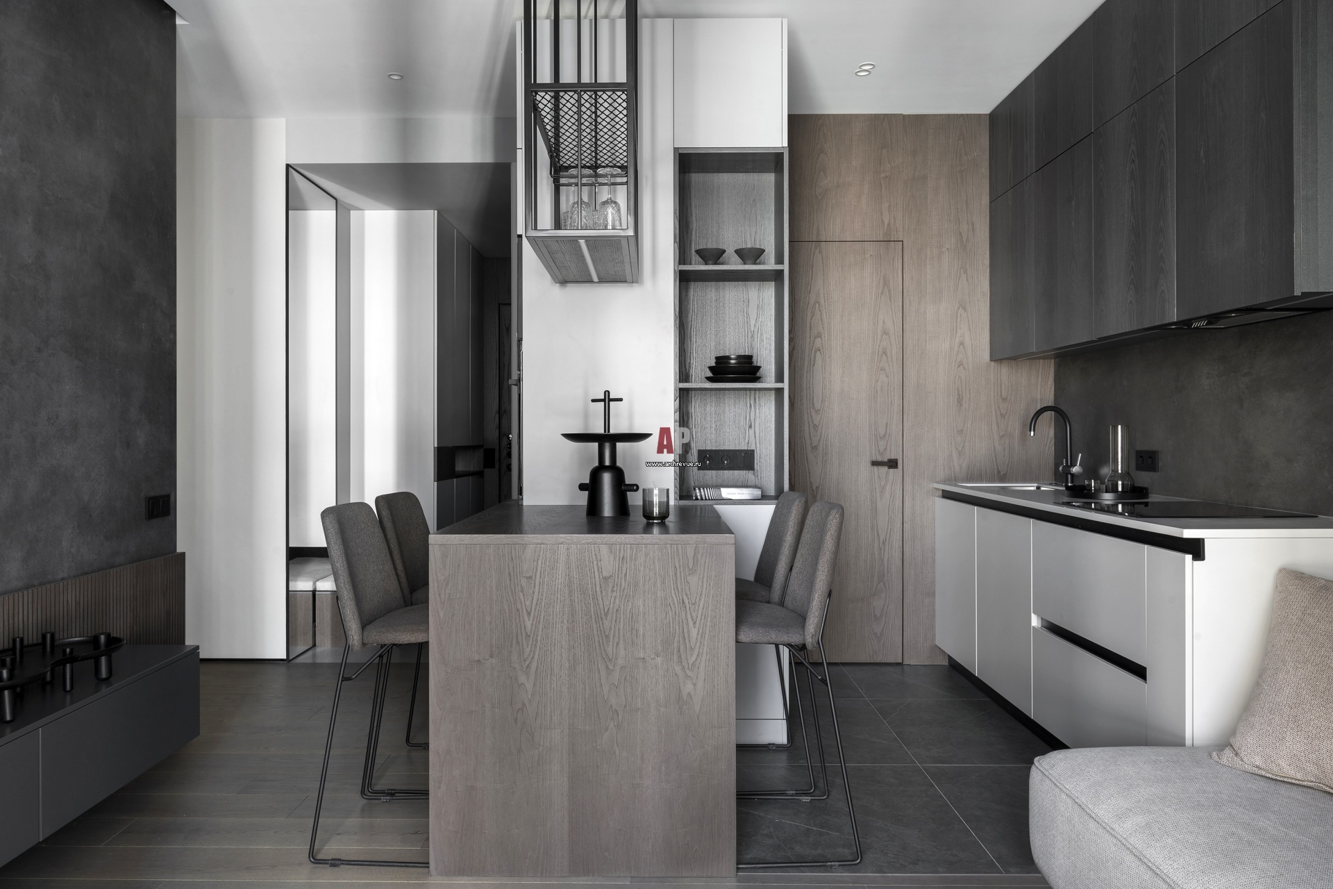 Зона кухни с барной стойкой. Дизайнеры изменили назначение третьего санузла, превратив его в хозяйственное помещение с постирочной, и сделали вход в него из кухни. Кухонная мебель, стеновые панели со скрытой дверью изготовлены на заказ.