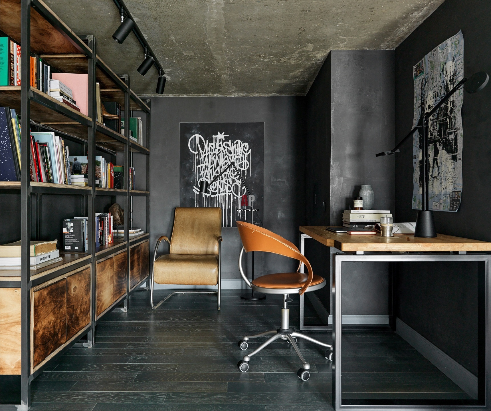 Кабинет на антресоли. Стены здесь выкрашены в графитовый, почти черный цвет. Потолок из строительного бетона. На полу – дубовая доска, тонированная в серый цвет. Металлический стеллаж и стол, «АрхПоле». Кресла винтажные. На стене – работа Евгения Сатарова.