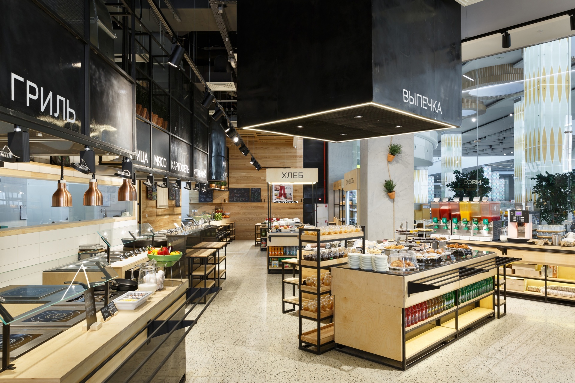Общий зал ресторана включает три зоны: фудкорт со свободным походом к сервировочным стендам и блоку с горячими блюдами, кассу и посадочную группу.