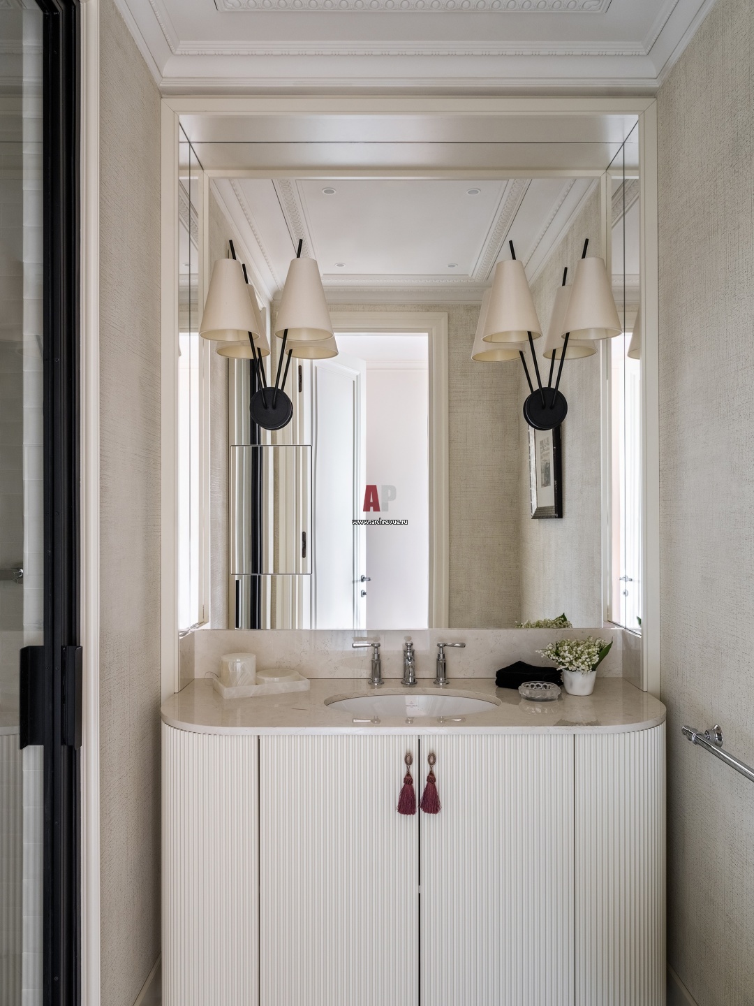 Интерьер санузла. Настенное зеркало и тумба с зеркальными фасадами сделаны по эскизам Лейлы Улуханли. Раковина, Villeroy & Boch.