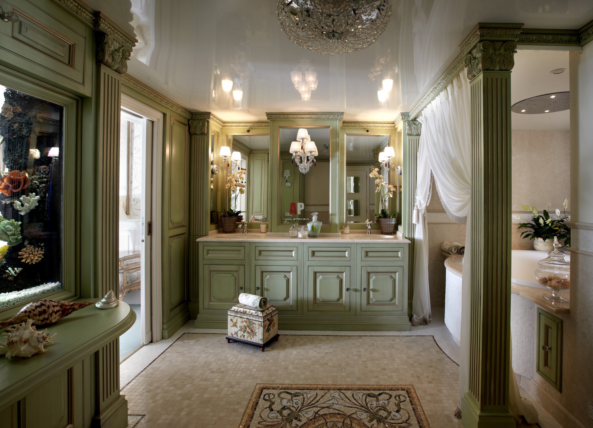 Ванная комната оформлена в стиле интерьеров Марии Антуанетты. Мебель для ванной и буазери фисташкового цвета выполнены по эскизам дизайнера. Круглая ванна в облицовке мраморной мозаикой, Kohler. Мраморная мозаика на полу, Sicis.
