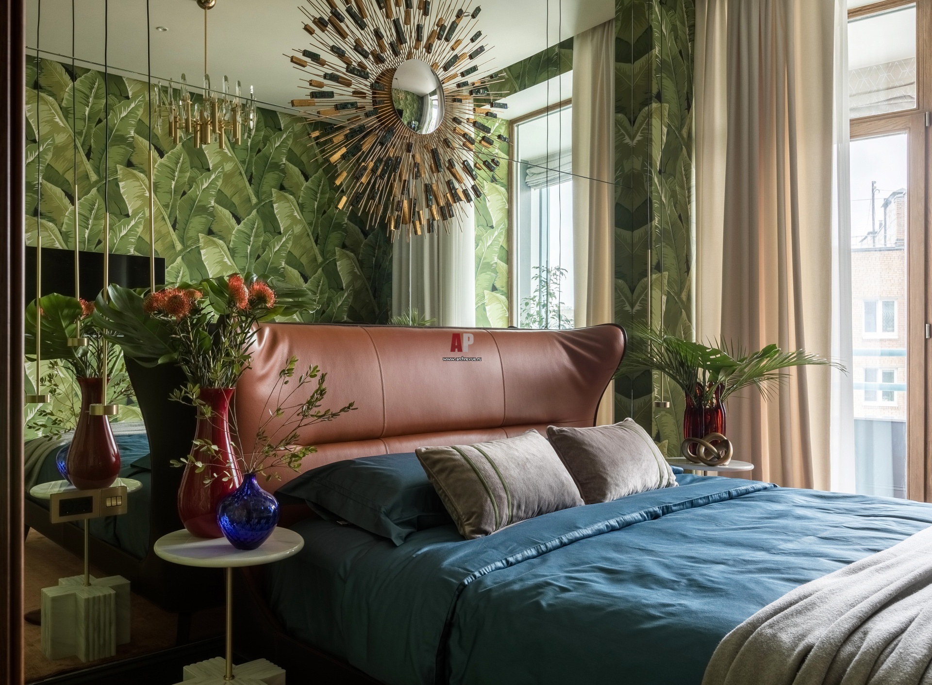 Интерьер хозяйской спальни с экзотическим декором. Обои с изображением банановых листьев Charleston Home от Jaima Brown. Кровать с кожаным изголовьем, Poltrona Frau, модель Mamy Blue. Прикроватные столики из камня, Olga Engel Design. Арт-объект над изголовьем – зеркало, Christopher Guy.