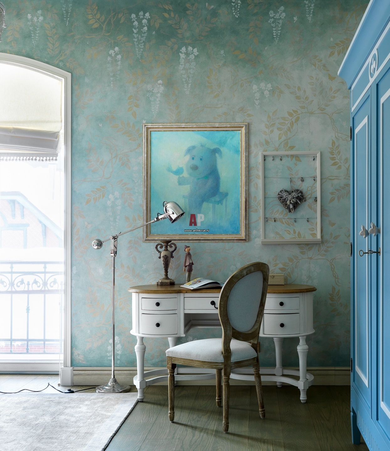 Спальня дочери в нежной голубой гамме. Дизайнеры перекрасили потолок в нежный беж, добавили потертости. Шкаф также был перекрашен в синий цвет. Рабочая группа, Riviera Maison.