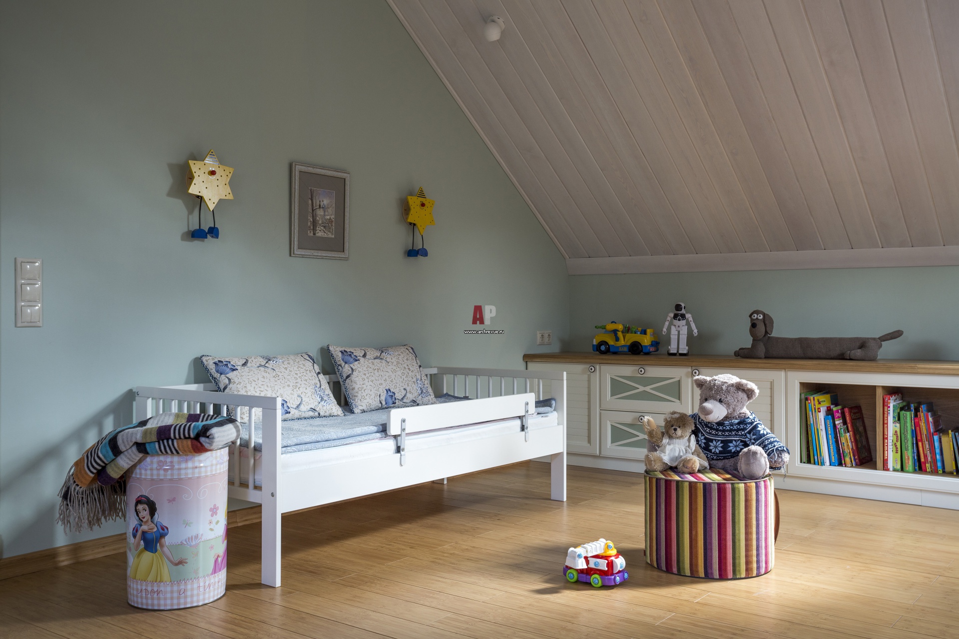 Дизайн детской комнаты в мансарде дома. Потолки подшиты вагонкой из беленого дуба. Стены выкрашены в светлый голубой цвет. Белая деревянная мебель сделана на заказ.