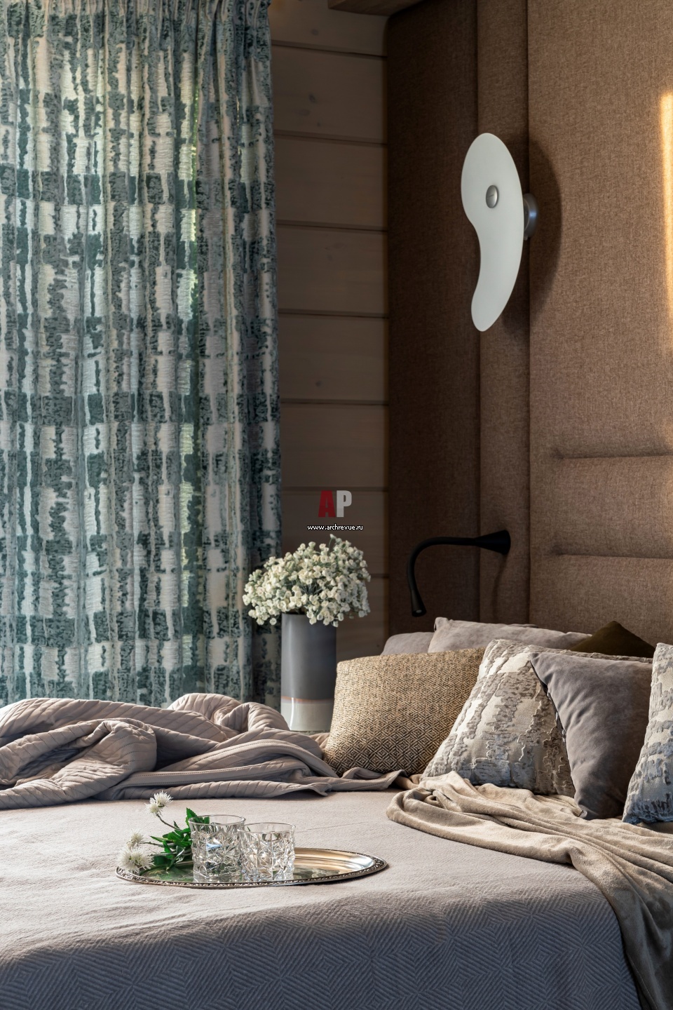 Деревянный гостевой дом с северным колоритом. Интерьер спальни. Светильники, Foscarini, модель Bit. Ридеры, Linea Light, модель Snake.
