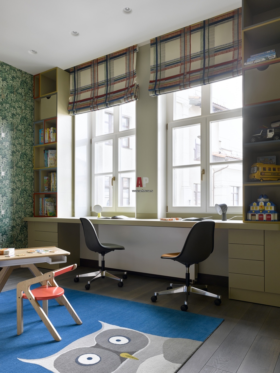 В детской комнате выделено 3 зоны: зона сна, рабочая часть и игровая для двоих мальчиков. Рабочий стол со встроенными шкафами, на заказ, изготовление, «Ассоциация русских мастеров».