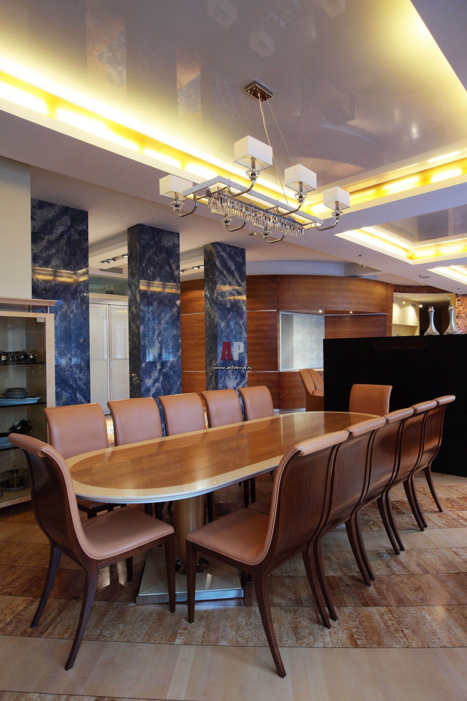 Просторная столовая включена в общую зону. Стол на 12 человек в стиле ар-деко. Мебель, Oak.