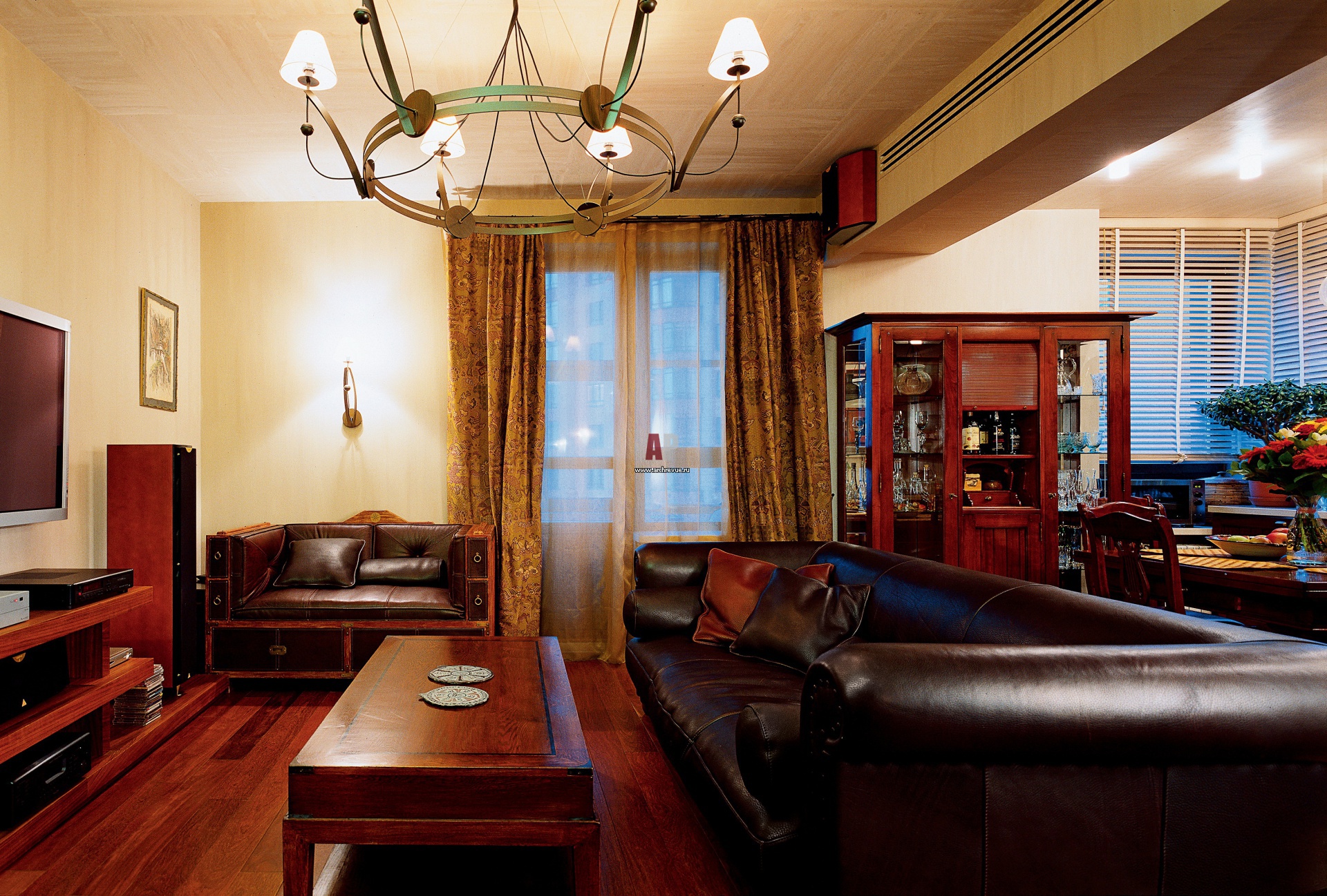 Интерьер гостиной строится на контрасте дерева разных пород и оттенков. Потолок подшит квадратами из светлого массива, пол выстлан паркетной доской из красного дерева. Современная металлическая люстра от Terzani выполнена в стиле кованых замковых светильников.