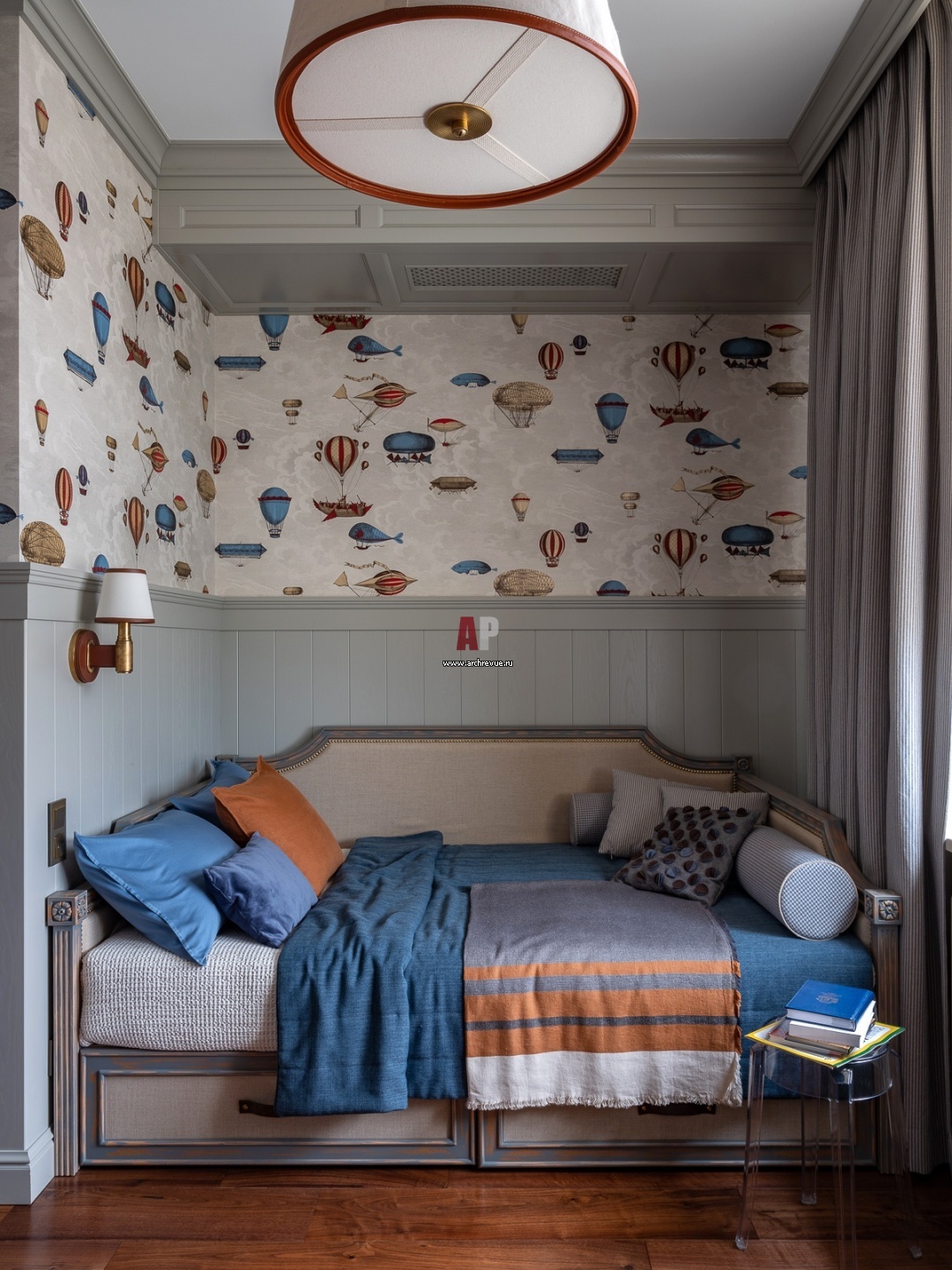 Комната сына-подростка. Большая кровать встроена в нишу, она сделана на заказ. Текстильное изголовье имеет интересную форму, корпус украшен резными декоративными элементами, а нижние выдвижные ящики в холщовой отделке дополнены кожаным ручками.