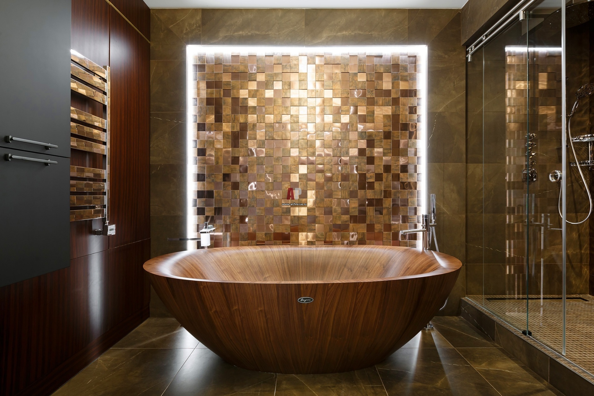 Ванная комната площадью 14 кв. м. с купелью из тика, душевой и туалетной зоной выполнена в духе СПА-комплексов 5-ти звездочных отелей. Ванна Alegna сделана вручную из тика. Смесители, Gessi. Мозаика на стене из натуральной меди.