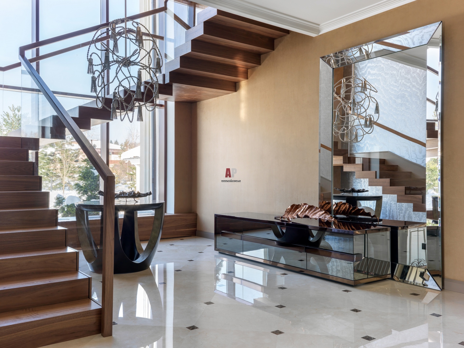 Лестничный холл на первом этаже. Напольное зеркало и комод, Fendi, Bryant. Ограждение лестницы сделано из прозрачного стекла, ступени и перила – шпон ореха. Люстра на лестнице, Brand van Egmond, модель Sultan of Swing.
