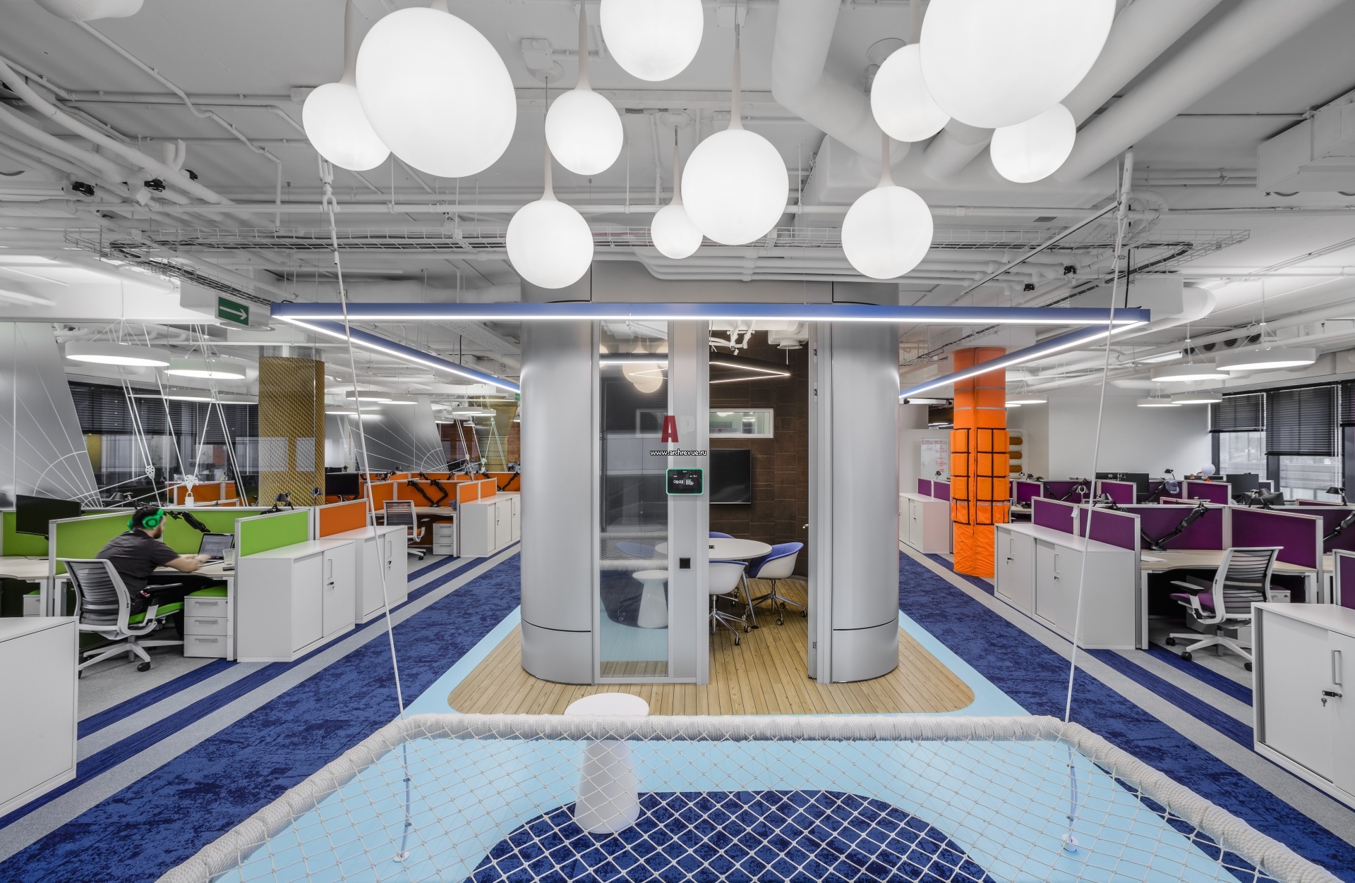 Рабочий open-space зонируют стеклянные перегородки, переговорная в виде рубки, а также спортивная зона с гамаком для активного отдыха.