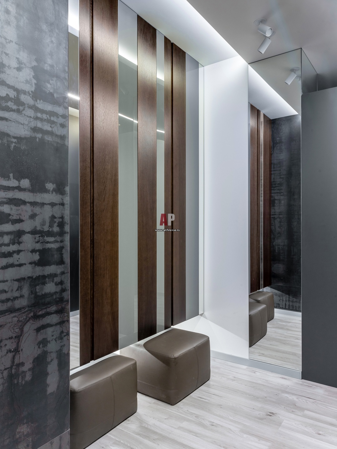 В оформлении коридора применяли листы металла горячего проката, у них очень красивый графитовый оттенок и естественные разводы. Металл очищен и покрыт лаком.
