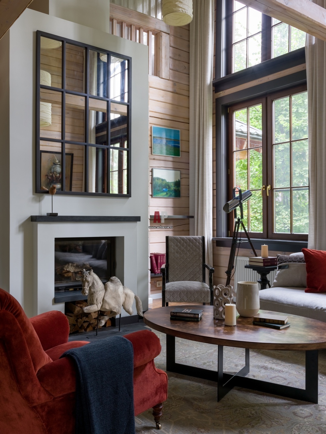 Каминный зал в деревянном доме. Портал и дымоход камина выкрашены в белый цвет и визуально облегчают интерьер.