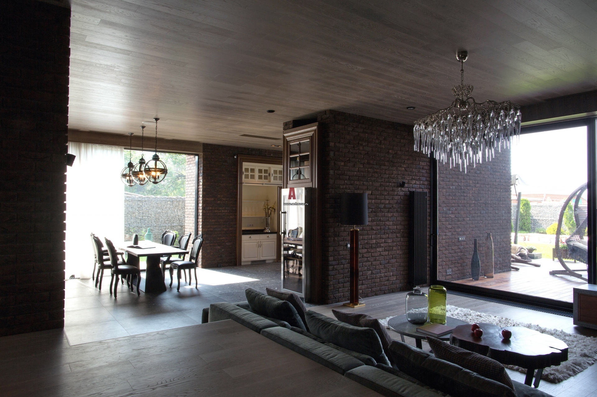 Общая зона первого этажа имеет сквозную планировку. Входная зона с низким потолком спускается к гостиной и кухне-столовой, где потолки уже значительно выше, оттуда перетекает в наполненную воздухом кухню-столовую с панорамным остеклением и выходом во двор.