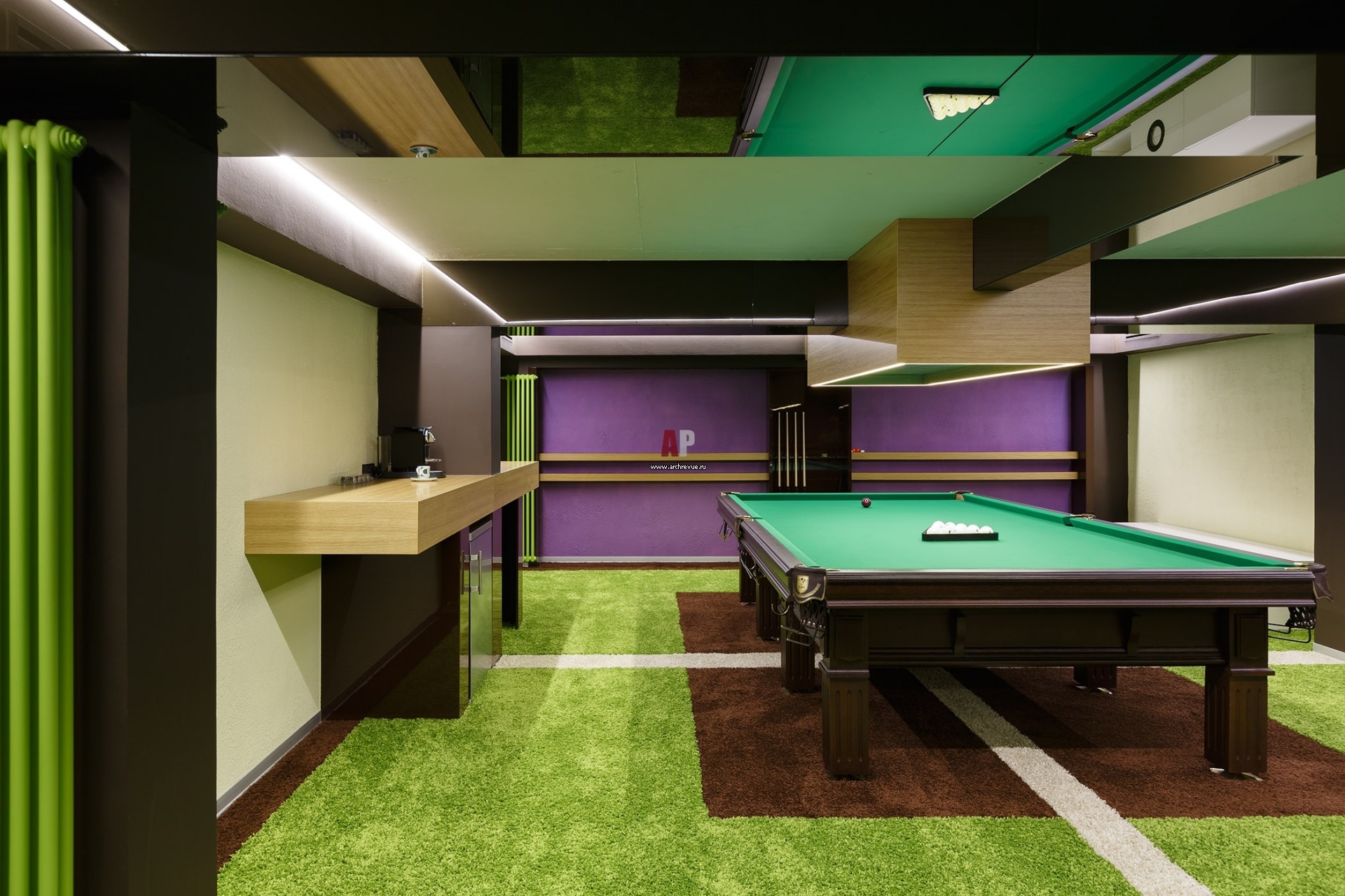 Бильярдная на минус втором этаже. Акцентная деталь интерьера – современные кессонные потолки с массивным светильником над бильярдным столом.