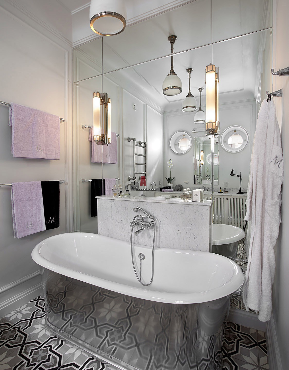 Интерьер женской ванной комнаты. На полу – цементная плитка с орнаментов в стиле ар-деко, поставщик «Грета Вульф». Отдельно стоящая ванна с зеркальной поверхностью.