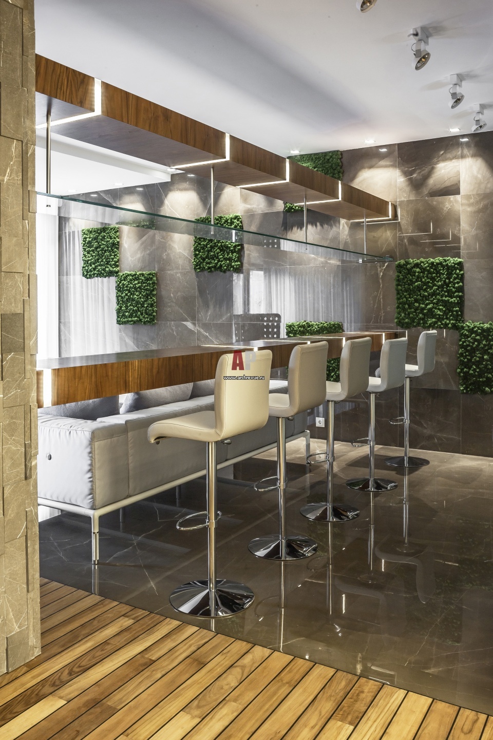 Барная зона в эко-стиле в интерьере зоны отдыха цокольного этажа.