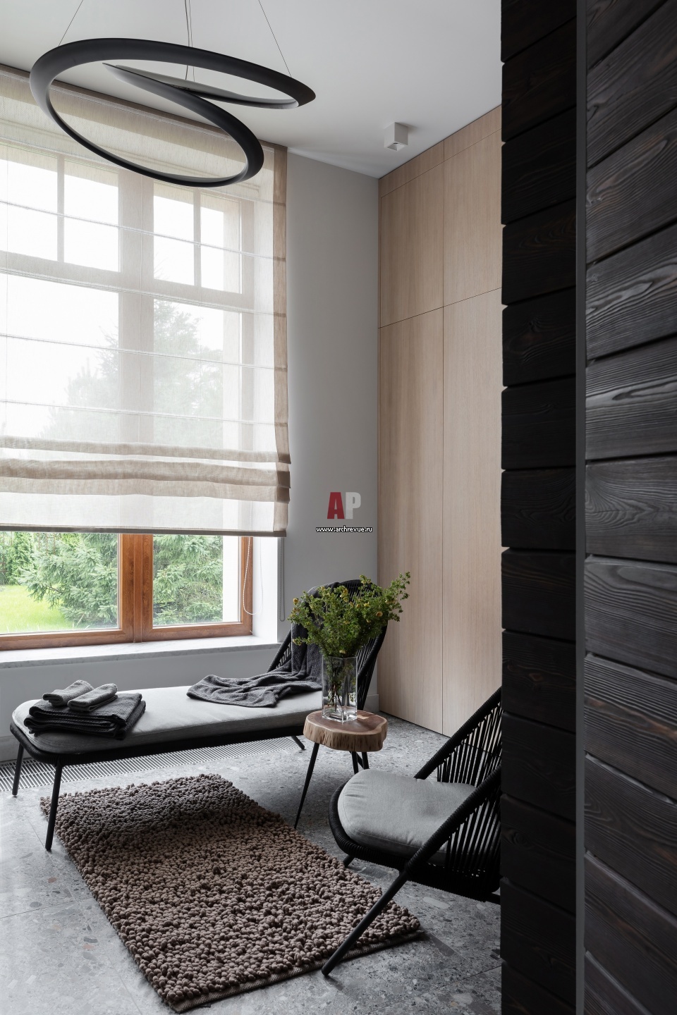 Спа-зона многофункциональна. Также она является постирочной, наполнение которой скрыто за лаконичными деревянными фасадами. Cветильник, Nemo.