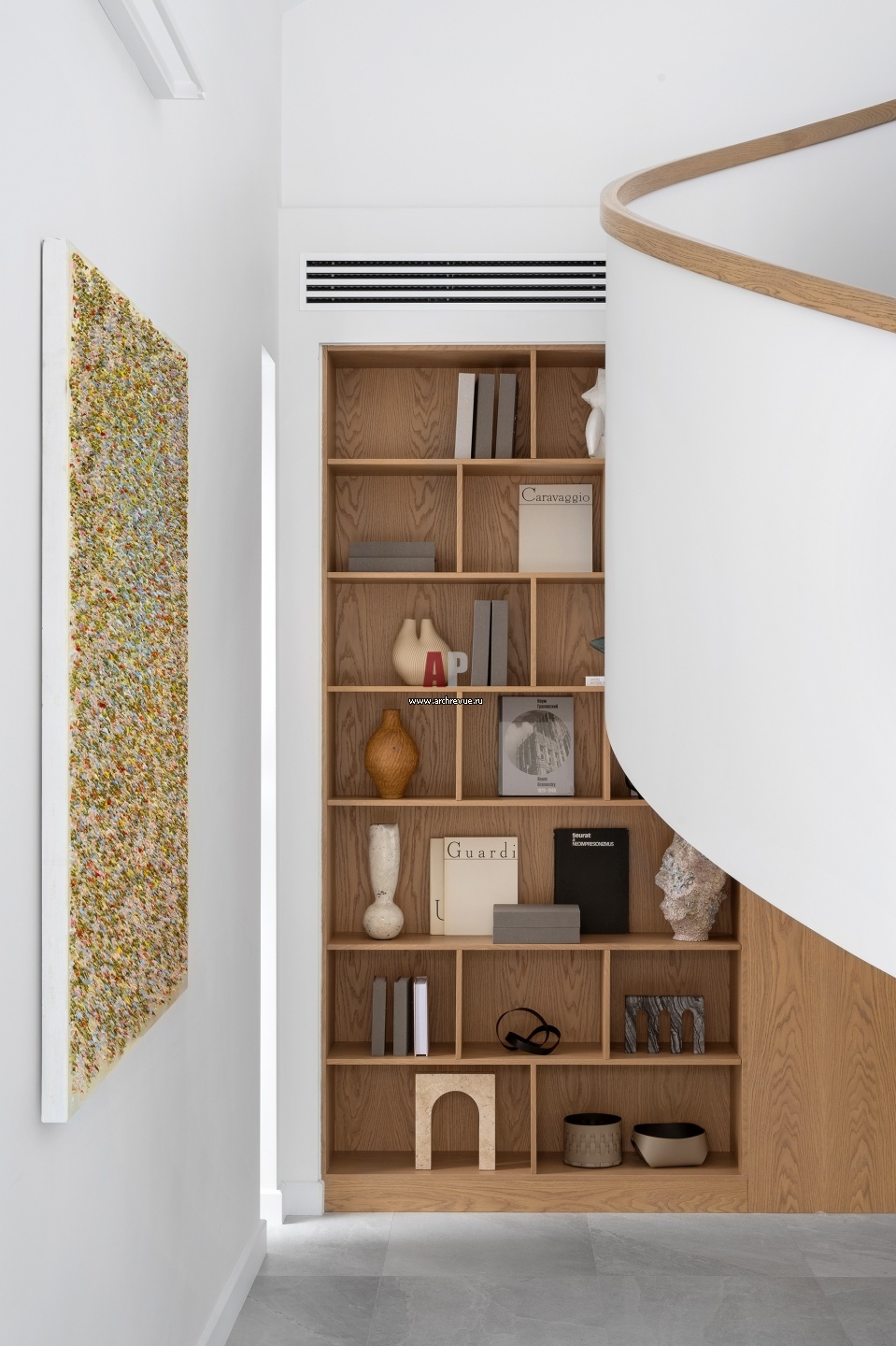 Встроенный шкаф за лестницей из шпонированного дуба. Текстура натурального дерева утепляет монохромный интерьер.