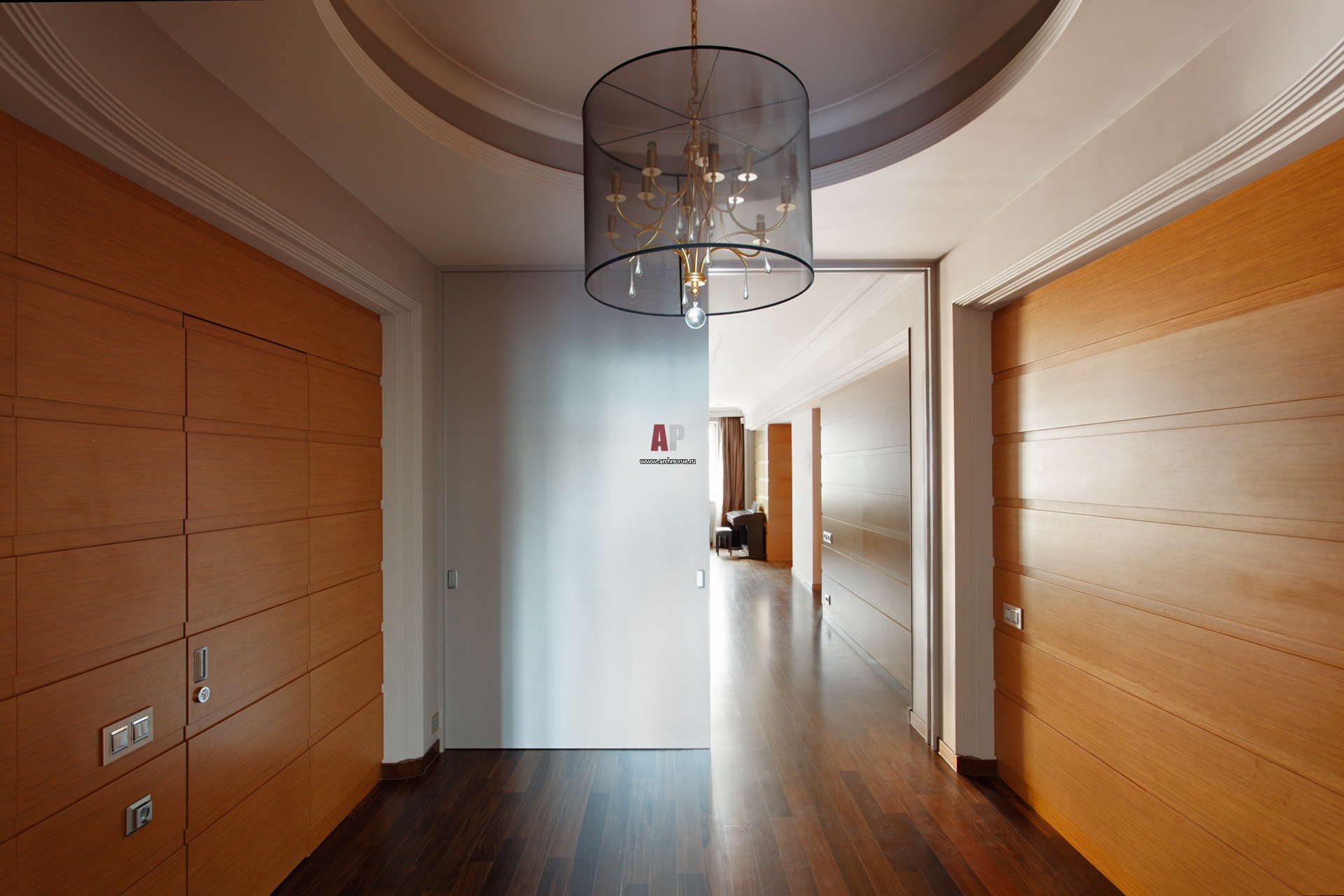 Внутренний холл облицован деревянными панелями. Они даже маскируют вход в детский санузел.
